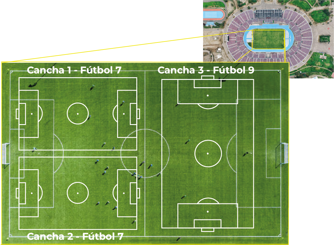 La organización dispondrá de 3 canchas de fútbol con reglamentación ANFP para disputar los partidos de las categorías 2018-2016 y 2014.